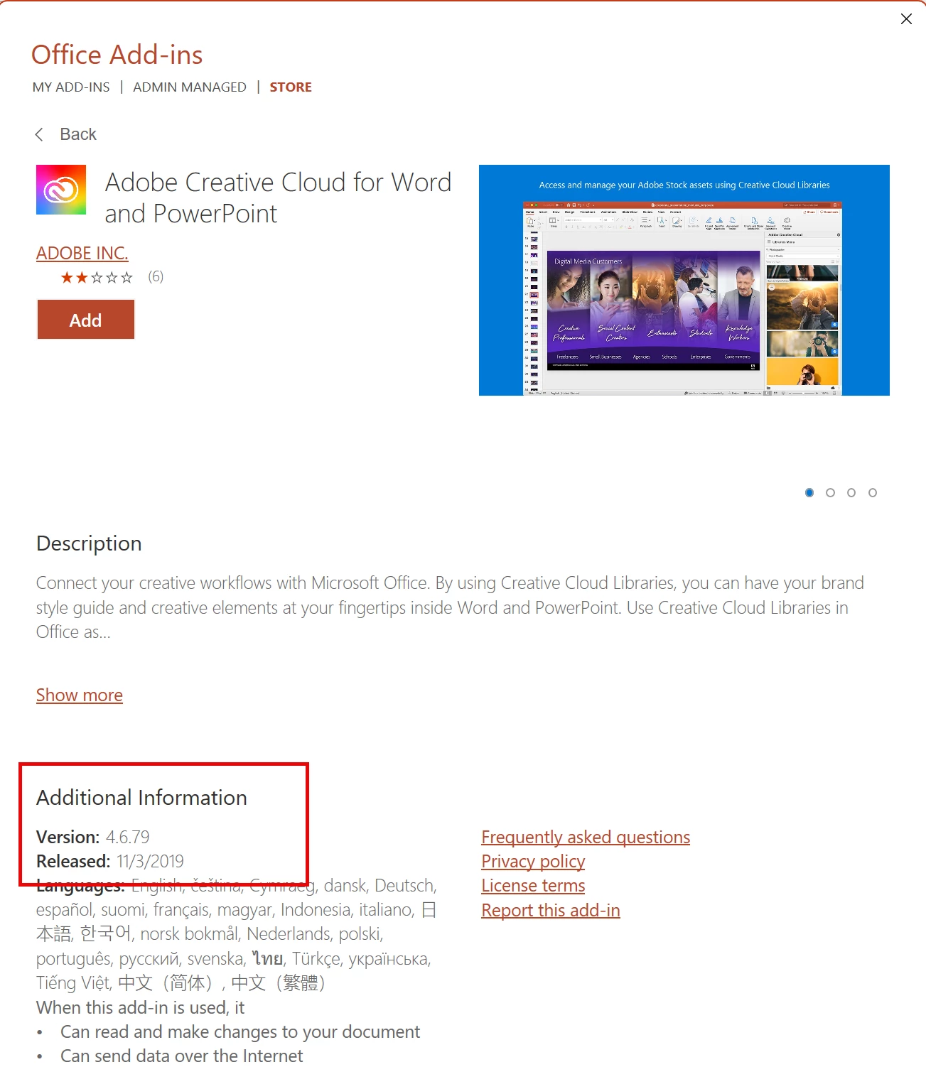 My team has experienced issues placing CC library assets within PowerPoint since January 2025. Assets created in InDesign or Photoshop are not longer supported through this plug-in. A very pixelated proxy image is inserted.