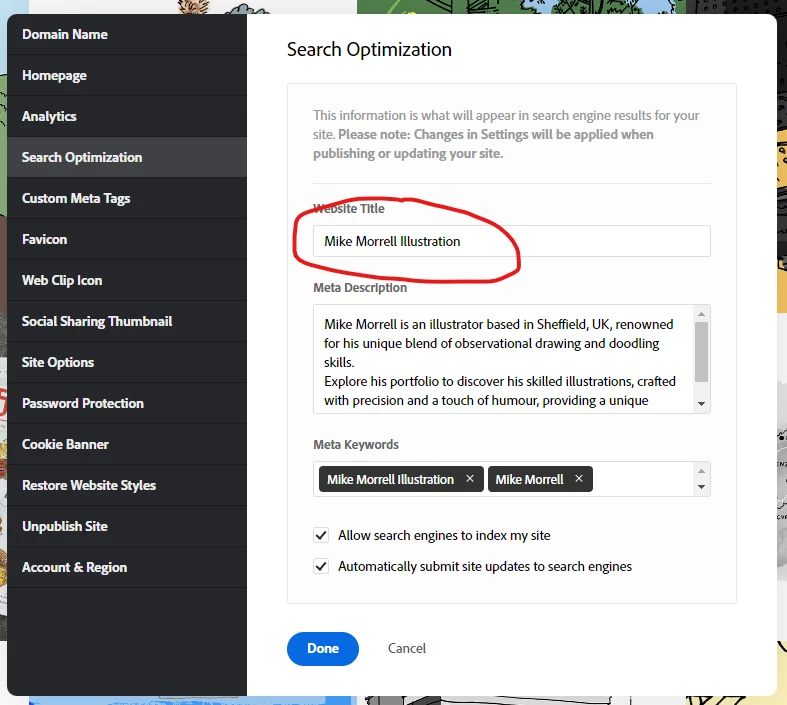 Trying to enhance my search results on google for my portfolio, any chance anyone could tell me how to get it to say Mike Morrell instead of Adobe?