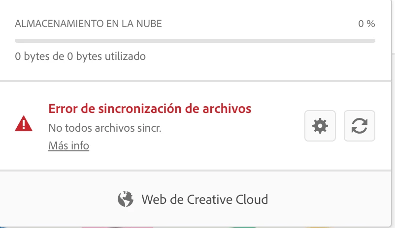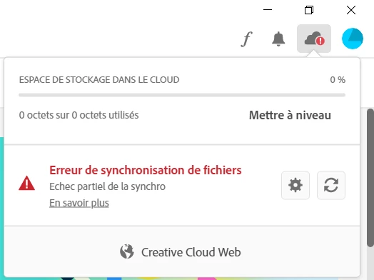 Uuser225703911nbyrParticipantForum|Forum|3 years agoJanuary 8, 2023QuestionCloud files don't syncForum|Forum|3 years agoJanuary 8, 20232 replies465 viewsHi,My creative cloud don't sync files and show this error message. Can't find the solution.File syncCloud storage web assetsCollaboration