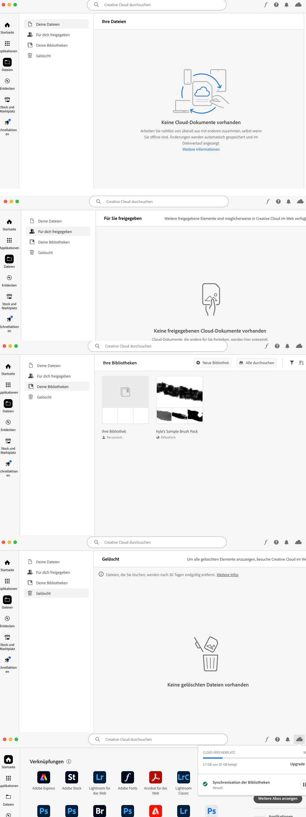Nun zu meinem Problem. Ich habe alle Clouddaten gelöscht, alle Bilder etc. habe den Papierkorb geleert und die Creative Cloud mit OPT+COM+R neu gestartet, es wird immer der gleiche verbrauchte Specherplatz von 3,7 GB angezeigt. Kein einziger Löschvorgang zeigt irgend eine Wirkung. Wo liegt das Problem? Warum kann ich die Cloud Daten nicht vollständig löschen? Warum macht es Adobe einem so schwer? Die ganze Hilfe hier auf Adobe ist unübersichtlich und nicht zielführend. Deshalb kann ich mich in einem letzten Schritt nur wieder hier in Adobe Community artikulieren. Das ist schwach Adobe.