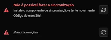 Estou tendo problemas com o código de erro 306. Não estava conseguindo entrar nos programas devido a outro erro da adobe, o qual não me lembro do código, então eu desinstalei os programas e o creative cloud. Porém ao instalar novamente, o erro 306 apareceu em várias tentativas de procedimentos, como sincronizar e desinstalar ou instalar um programa. Ao clicar no erro, sou redirecionado para uma página da Adobe que diz que a solução é fazer o download da versão mais recente/atualizada do instalador, mas já fiz isso e o erro persiste.