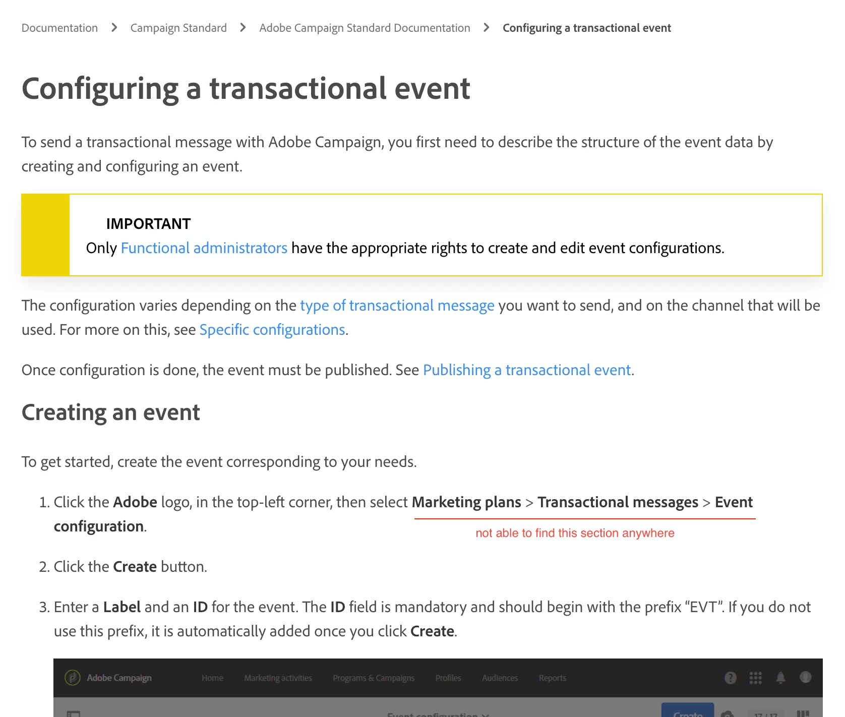 Hi there, I am new to the adobe community, I just created my account yesterday and trying to create events for transactional emails and standard campaigns. I am following the link to configure the event (https://experienceleague.adobe.com/docs/campaign-standard/using/communication-channels/transactional-messaging/event-configuration/configuring-transactional-event.html?lang=en). But I am unable to see the section 'Marketing plans'.