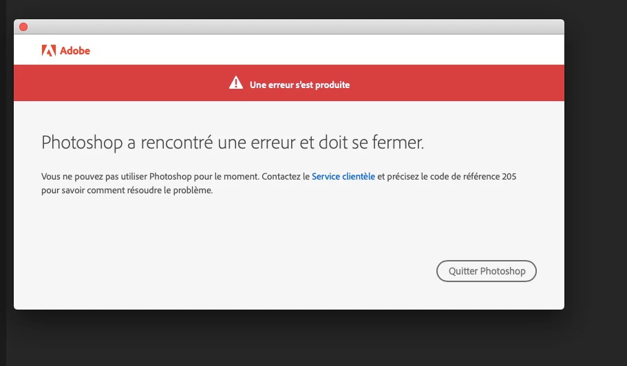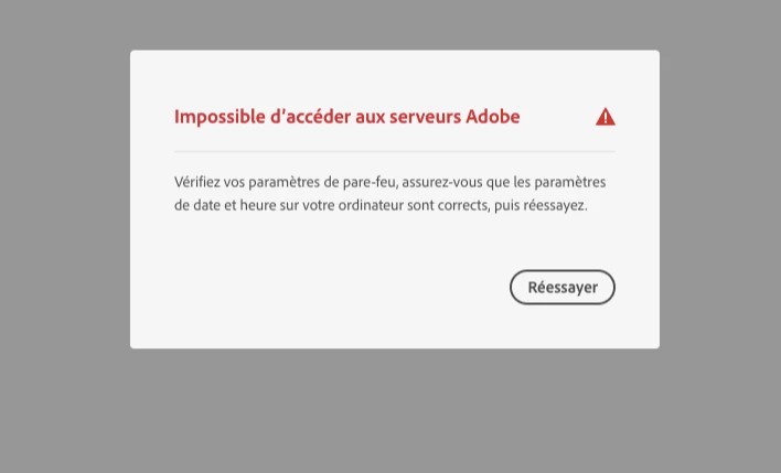 EElisa5D3DParticipantForum|Forum|5 years agoSeptember 17, 2020QuestionConnexion Creative cloud desktop impossibleForum|Forum|5 years agoSeptember 17, 20201 reply316 viewsBonjour, Je ne peux plus me connecter sur mon creative cloud desktop et donc ni utiliser la suite adobe sur mon ordinateur (le message en pièce jointe apparaît). Que dois-je faire pour régler ce problème ? Merci d'avance. Collaboration