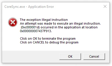 An attempt was made to execute an illegal instruction (0xc000001d) occurred in the application at location 0x000000007437F913.