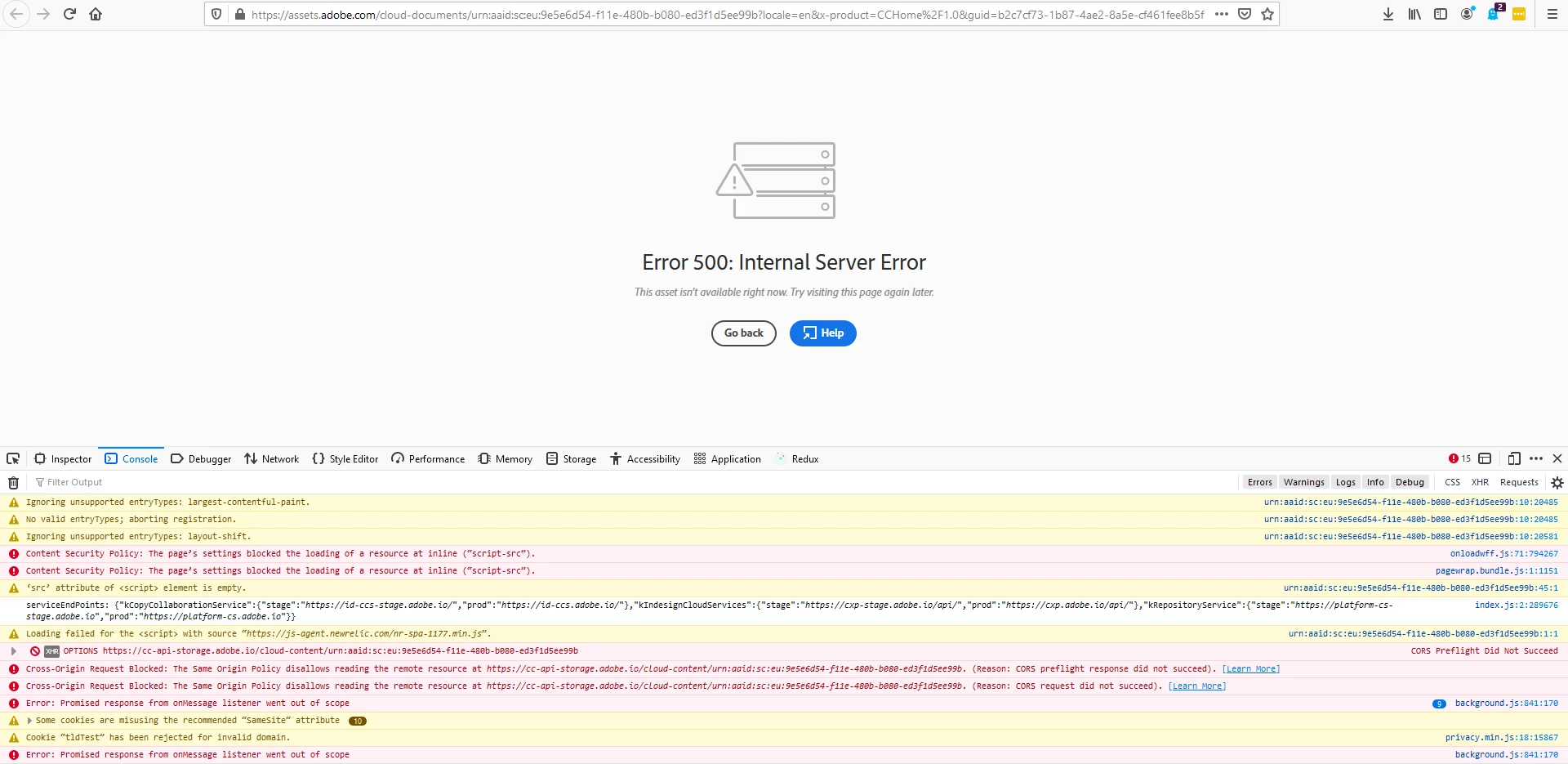 Hi, I get this error when I try to access my XD project on Creative Cloud website. The error message in the console says the followig: