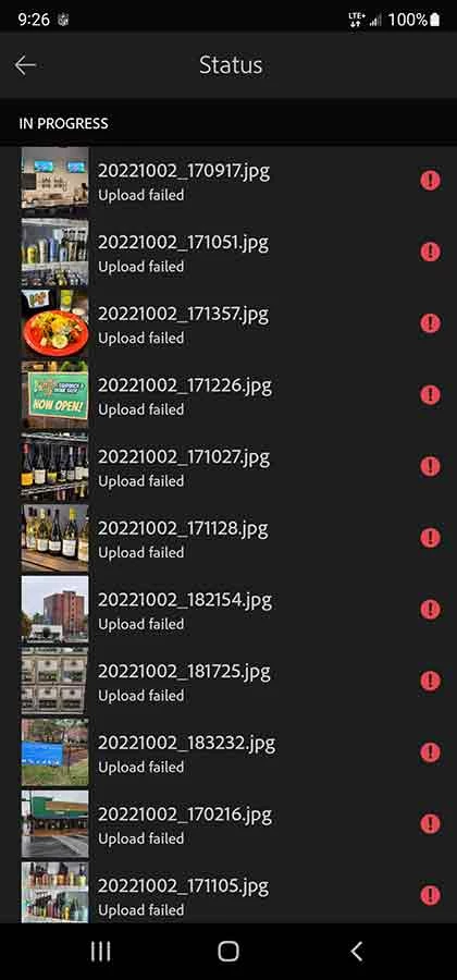 For the last week or so, my attempts to upload photo files from my Samsung Galaxy S22 Ultra have partially failed. One or two files will upload normally, but all the rest just get marked UPLOAD FAILURE. Before this began happening, I was able to upload many files, but am still only using a tiny fraction of my total Adobe Cloud storage quota.