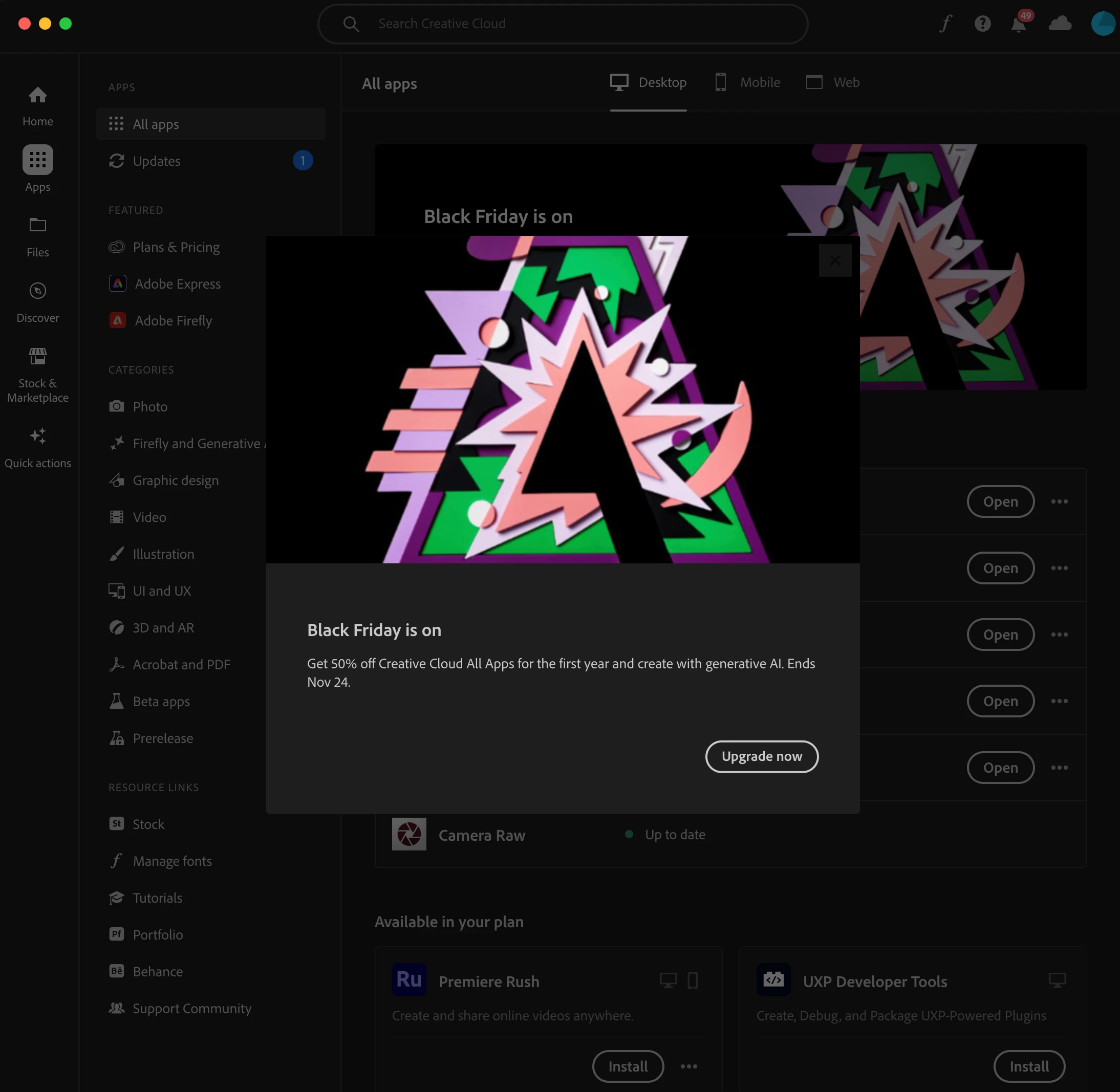I am just here to express my frustration about the current black friday sales popup in my creative cloud app. It shows me this large popup wiith a special offer and only one button "Upgrade Now" and that's it. I can't access any settings for apps or update apps through the creative cloud app right now.
