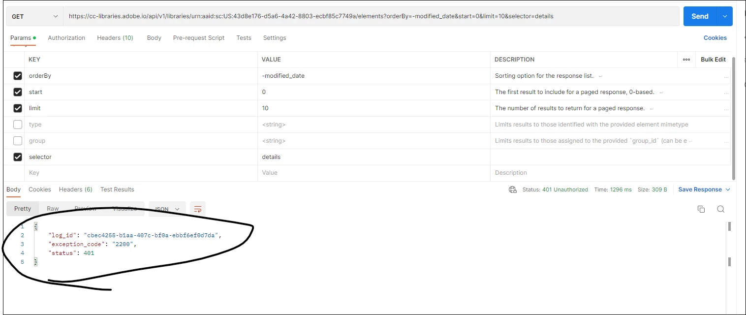 1. I am trying to get the Creative Cloud Assets' data using API. And I am able to get the basic info about the assets using {{baseUrl}}/api/v1/libraries/{{library_id}}/elements?selector=default.