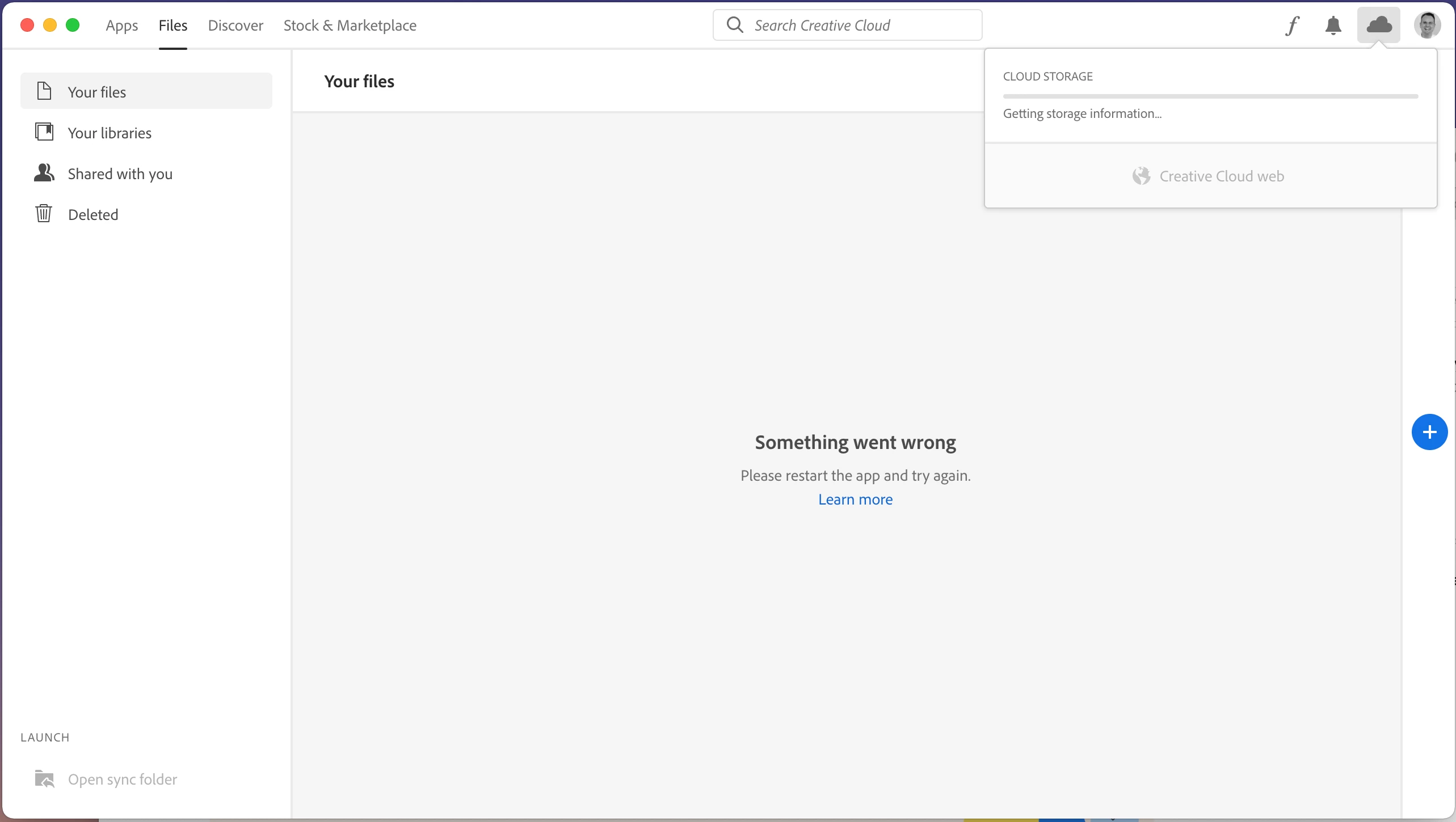 I have Creative Cloud and many CC apps on my Macbook Pro. The apps all work, and even the CC desktop app shows my librariess. However, it will not show my files. I am unable to access my CC online files through the CC app. The only error I receive is a notice stating, "Something went wrong. Please restart the app and try again." I've tried restarting the app, restarting my computer, uninstalling and reinstalling the app, and still it will not show my files. I am at a loss and this is a horrible way to work. My files are inaccessible.