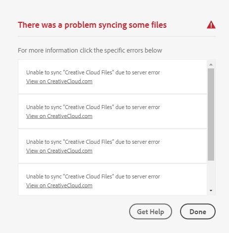 When I go to Sync with the desktop app, it errors out with the following, saying "Some Files Failed to Sync" and when I go to "Learn more" it says "Unable to sync creative cloud files' due to a server error.. But I've already reset my hosts files with the adobe host reset tool ( a suggestion for this error) as I've been troubleshooting this for a while.