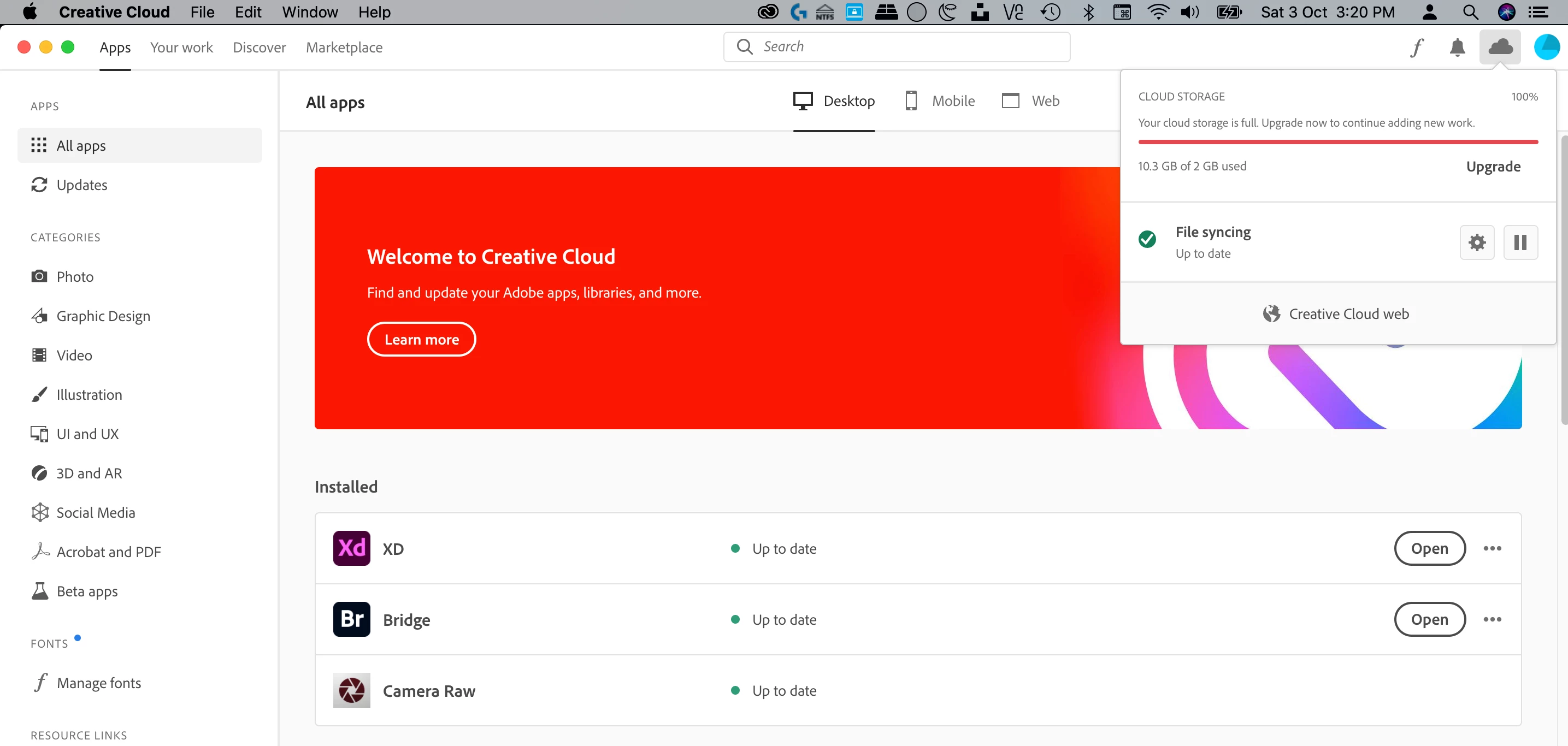 Creative Cloud desktop (on macOS) & web apps incorrectly displays cloud storage overfull.