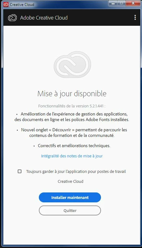 Il y a un mois le CC Desktop marchait très bien. C'est depuis cette mise à jour OBLIGATOIRE que je ne peux plus utiliser CC Desktop. Au service client ils ont essayé de m'aider mais n'ont trouvé aucune solution pour l'instant.