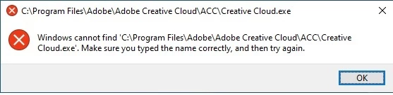 Creative cloud does not want to open, it says - Windows cannot find C:\Program files\ ..............\Creative Cloud.exe . Make sure you typed name correctly, and try again.