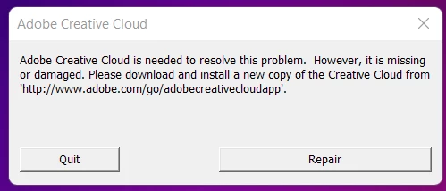 If I chose repair, I have the same problem. If I go to the address mentioned in the error message, the page is non existing. If I uninstall the app through adobe's uninstaller, dowload a new copy, restart and install again, I have the same problem.