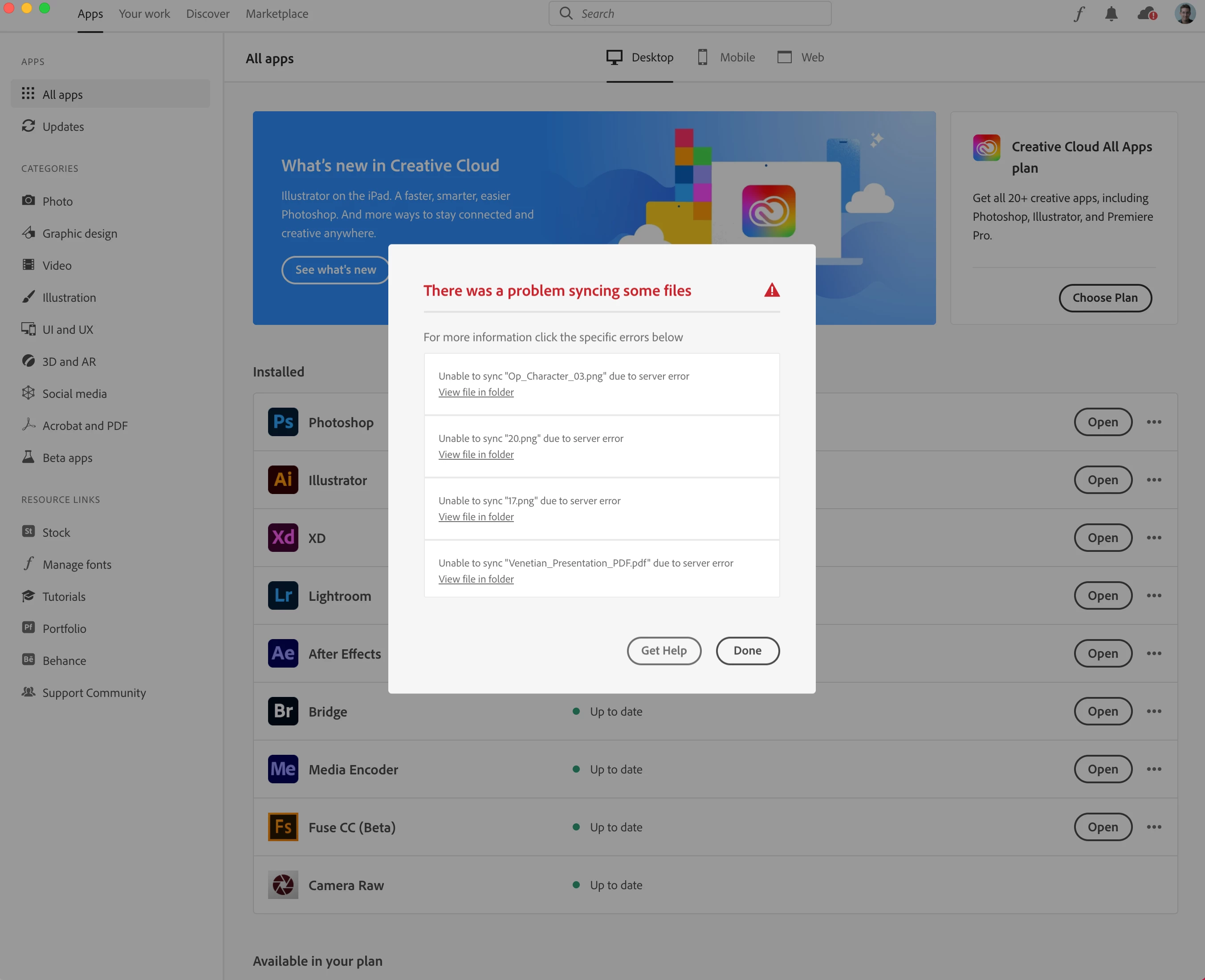 Creative Cloud Files not syncing due to server error.