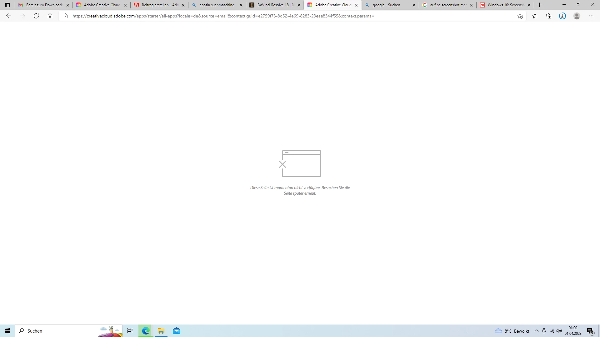 Ich habe mir das Abo für die Creative Cloud gekauft und will nun die Apps runterladen mit dem Link in der Email, jedoch steht immer geschrieben: Diese Seite ist momentan nicht verfügbar. 😕😕 und ich komm nicht mal dazu irgendtwas zu installieren. Ich verwende Windows 10 auf meinem PC.