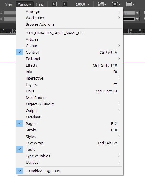 The Libraries panel is completely blank, no error message or anything, and in the Window menu it is listed as %dl_libraries_panel_name_cc.