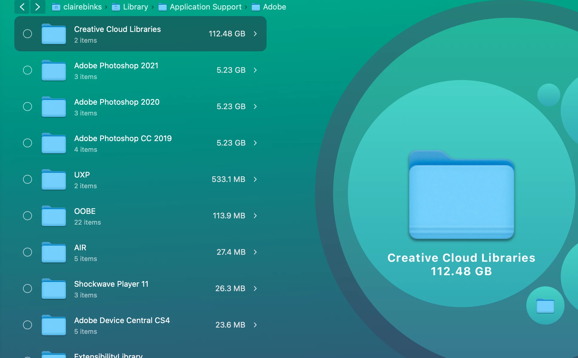 I cannot get my photoshop to run properly and my macbook is constantly runing out of space even though I have delteted over 50 gb off my hard drive. I checked the creative cloud library file size and it's 109 gb! What the heck is in this folder that is taking up so much space. When I drill down through the folders I get to a dcx folder with components that look like all photoshop fx pattern files.