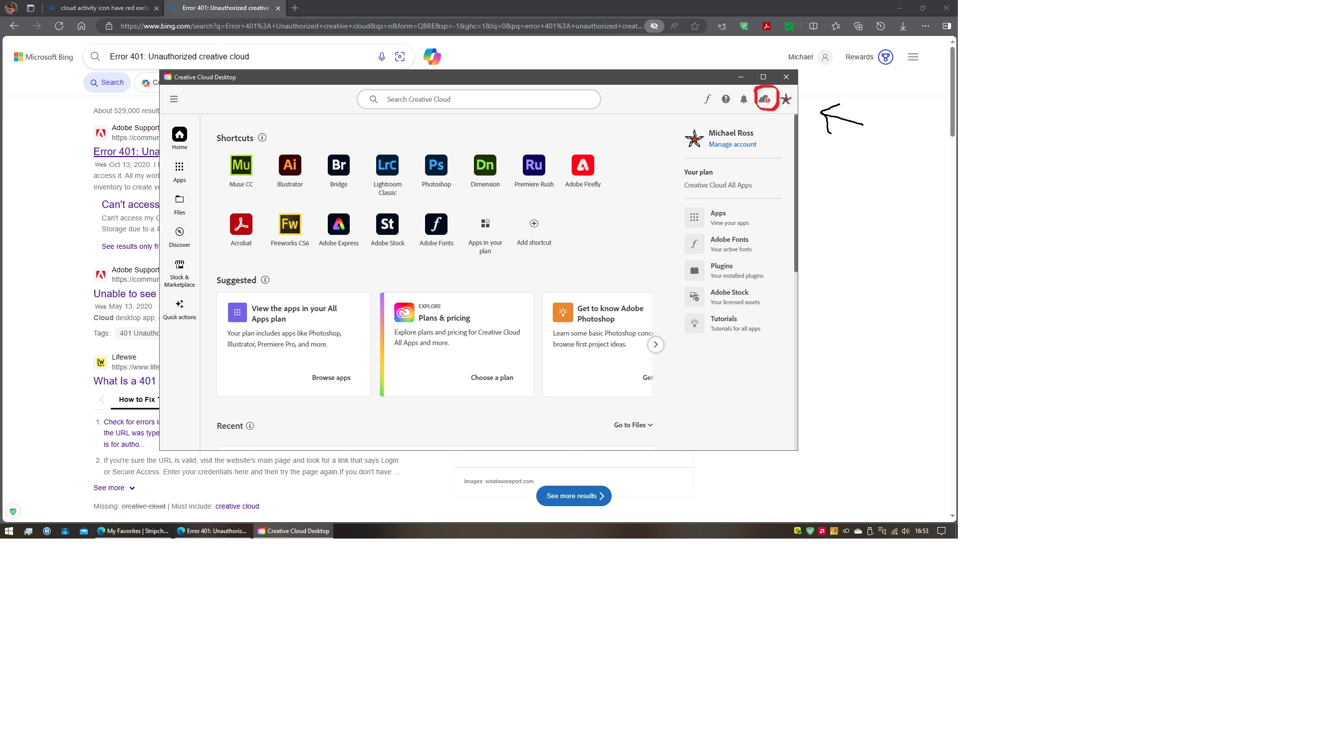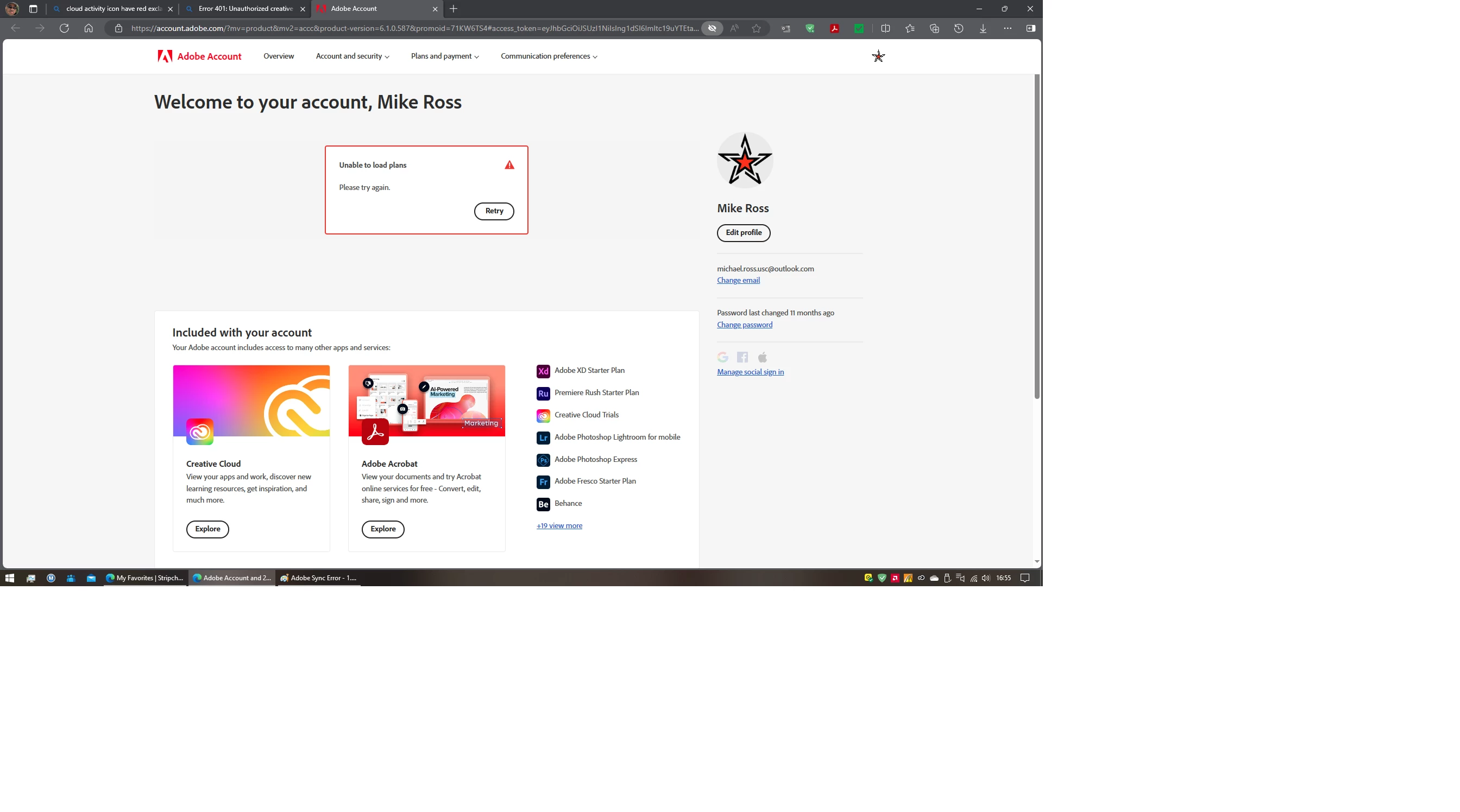 I'm running Creative Cloud version 6.1.0.587, Windows 10 version 22H2. Every time I boot my PC I get a red triangle with an exclamation point on taskbar icon and in the app the cloud icon has a red circle with an exclamation point. I get no other error messages of any kind. When I log into my account, my plan details are no able to be loaded, and I get a 'Error 401: Unauthorized' message and can't access my cloud account. Mind you, everything else works fine, as I can download and open apps, and access my account and view everything other than my plan details. I'm not sure why this is happening and it recently started a few week ago. I've included screen shots to to demoenstrate when I'm talking about.