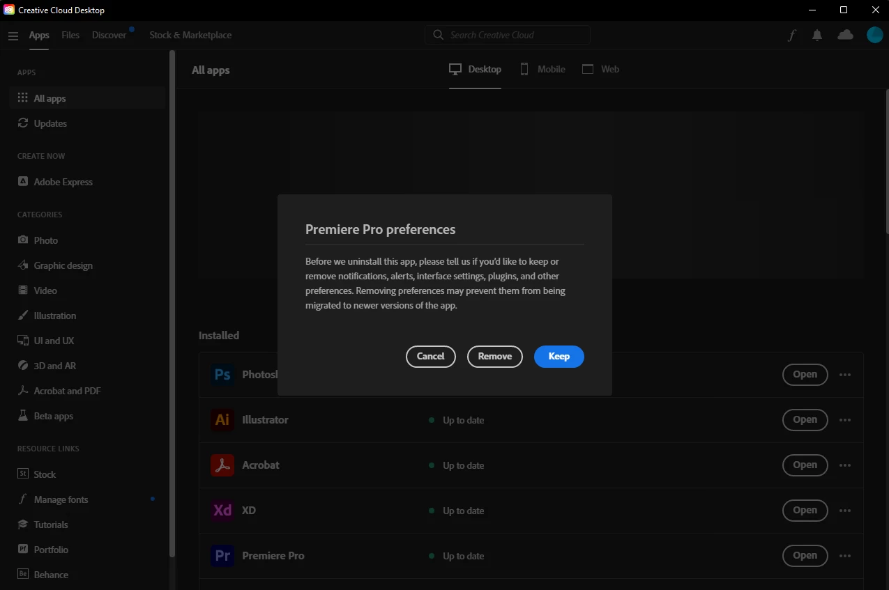 Creative Cloud won't let me work on my PC, keeps asking for uninstall options