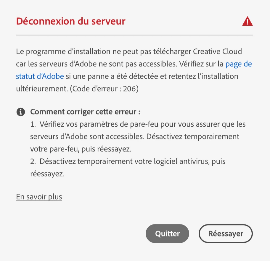 Lorsque je tente d'installer creative cloud, je suis sans cesse retourné sur une page de connexion internet puis après quelques minutes on m'affiche la page d'erreur suivante " le programme d'installation ne peut pas télécharger Creative Cloud car les serveurs d'Adobe ne sont pas accessibles...code d'erreur 206".