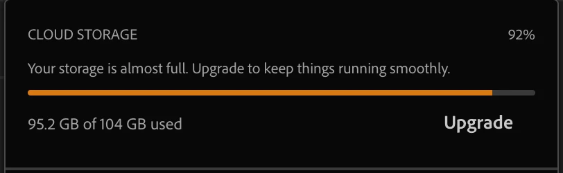 I've been running low on space for my Creative Cloud storage 100 GB. I use this storage space mostly for my Adobe Fresco art and as a way to move files from Photoshop on my Mac to my iPad and vice versa (not Lightroom).