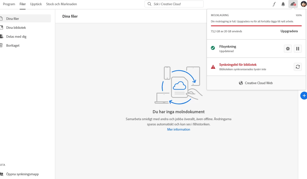 I earlier had the big package with al the apps and 100gb cloudstorage, but i downgraded to the photography kit with only photoshop and lightroom with only 20gb cloud storage. It kept complaining about beeing overly filled so i emptied it nearly completly but the warning pop up is still there.... it still says i store 73.18gb of material in the 20gb space....