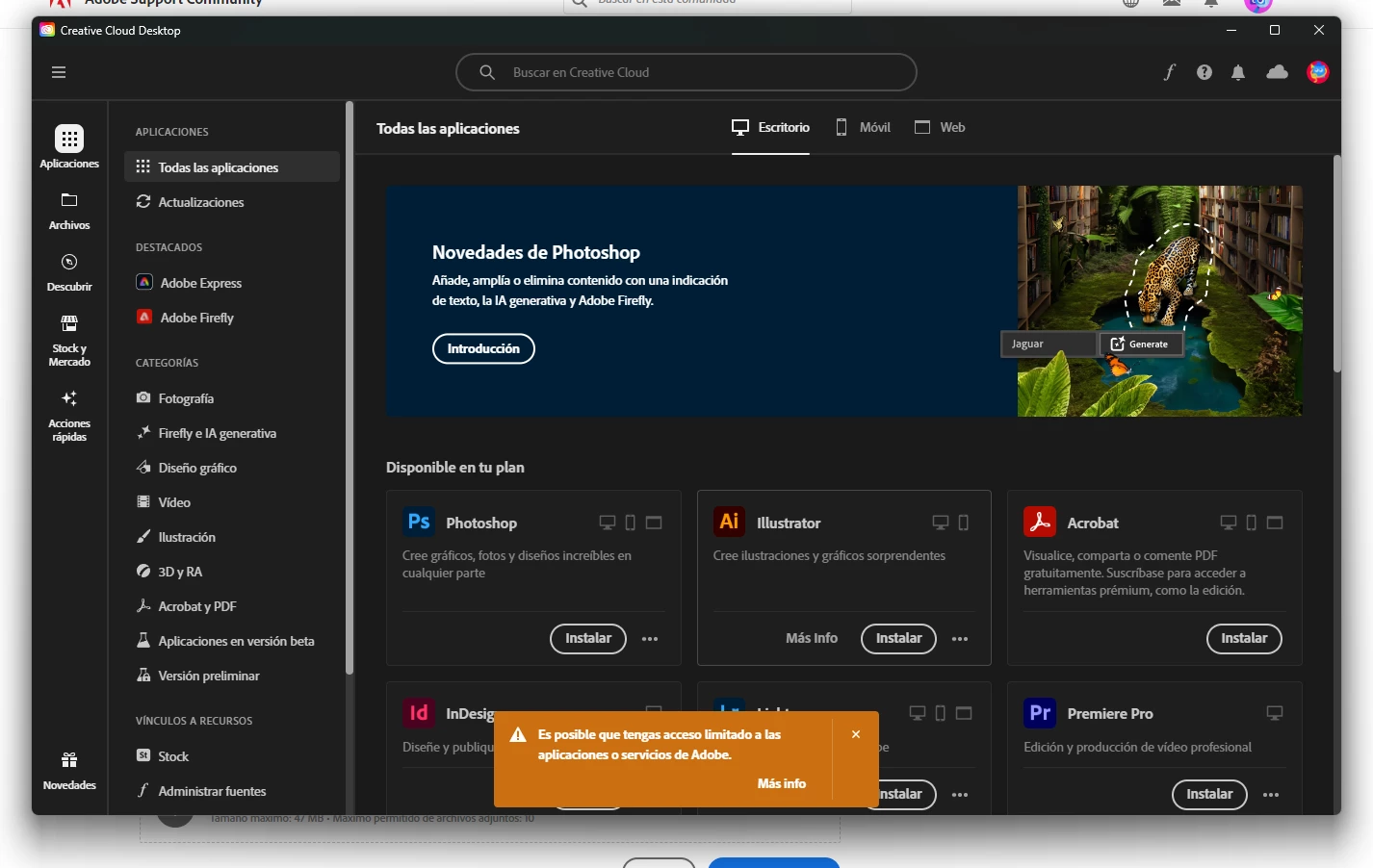 Error de acceso limitado en la aplicación de escritorio de Creative Cloud