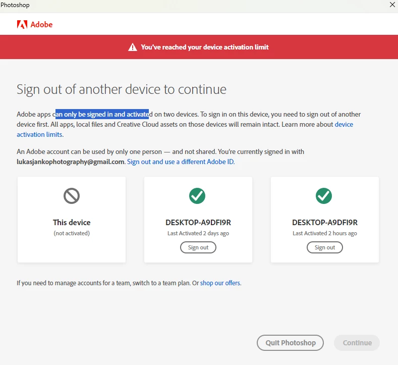 Why I have to log in all the time ? I have a year subscribtion and this is incerible annoyig. Also if I am offline, I just can't use it at all. I am using photoshop and lightroom. Once I also got this message. I don't get it. I don't share it with anyone, nobody also have access to my PC, really weird.