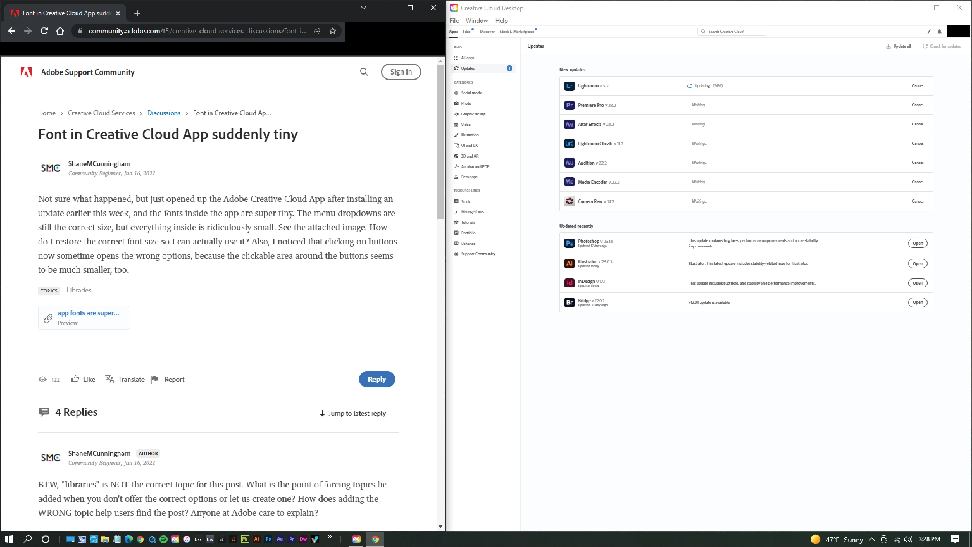 Not sure what happened, but just opened up the Adobe Creative Cloud App after installing an update earlier this week, and the fonts inside the app are super tiny. The menu dropdowns are still the correct size, but everything inside is ridiculously small. See the attached image. How do I restore the correct font size so I can actually use it? Also, I noticed that clicking on buttons now sometime opens the wrong options, because the clickable area around the buttons seems to be much smaller, too.
