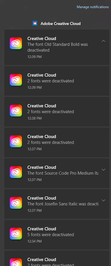 Any time I try to activate a font, it will say it's activated in Creative Cloud, but I immediately get this notification even though it shows up as active in Creative Cloud. I've tried restarting my computer, signing out of the account and signing back in, deactivating the fonts and reactivating them, and I have the most up to date version of the apps. Also, when I use a template from Adobe Premiere Pro, it will automatically deactivate the font. However, when I check the Creative Cloud it says the font is active.