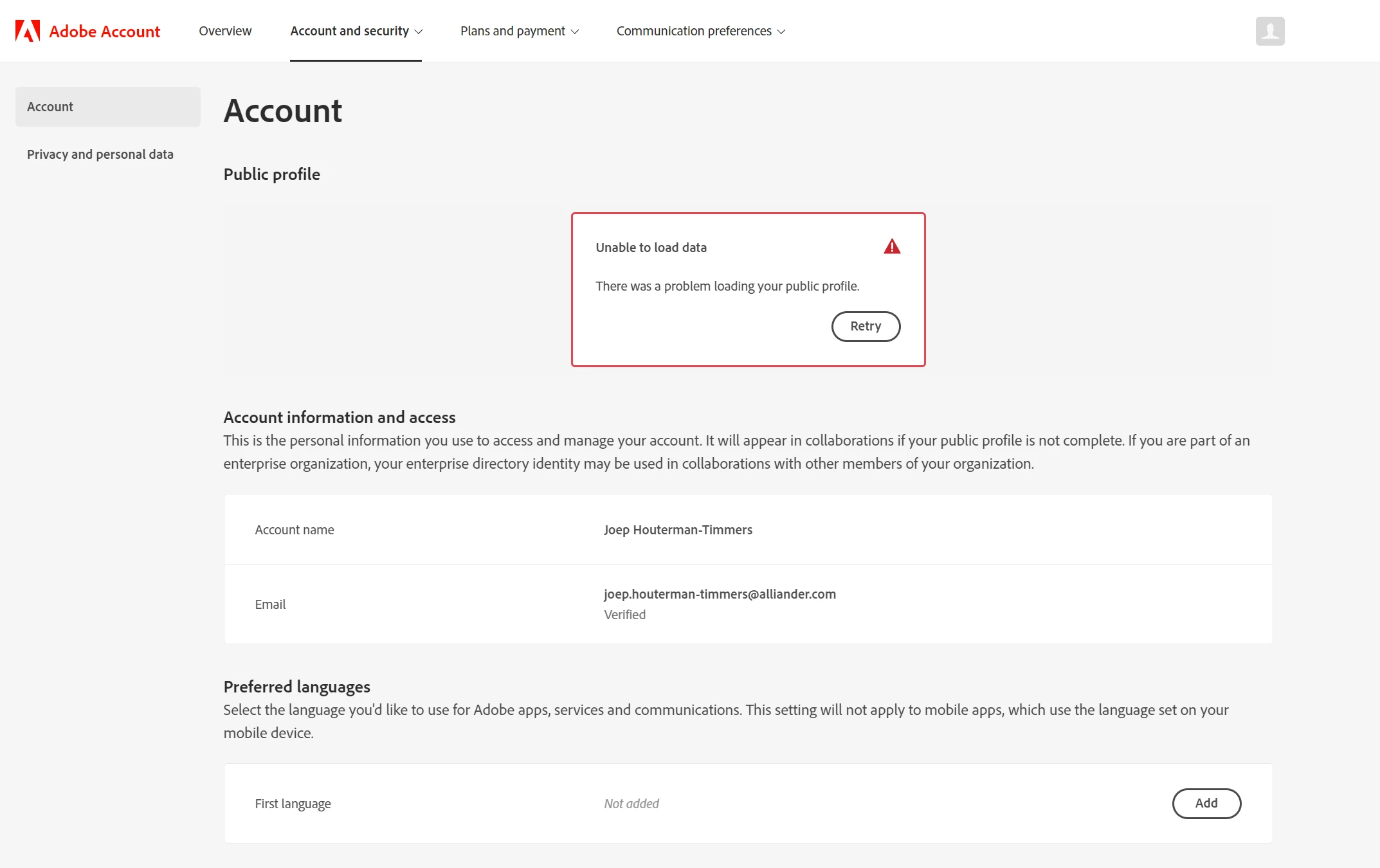 Recently, when I open Creative Cloud, it says that I have a free account (XD on 7 day trial/Photoshop & Illustrator locked) which is not true. I have a paid account, Creatve Cloud simply doesn't register it. When I try to open my account in account.adobe.com, it simply says 'There was a problem loading your public profile' (see screenshot). Restarting my machine doesn't help, neither does logging out and logging in. Can I get access to my paid account please?