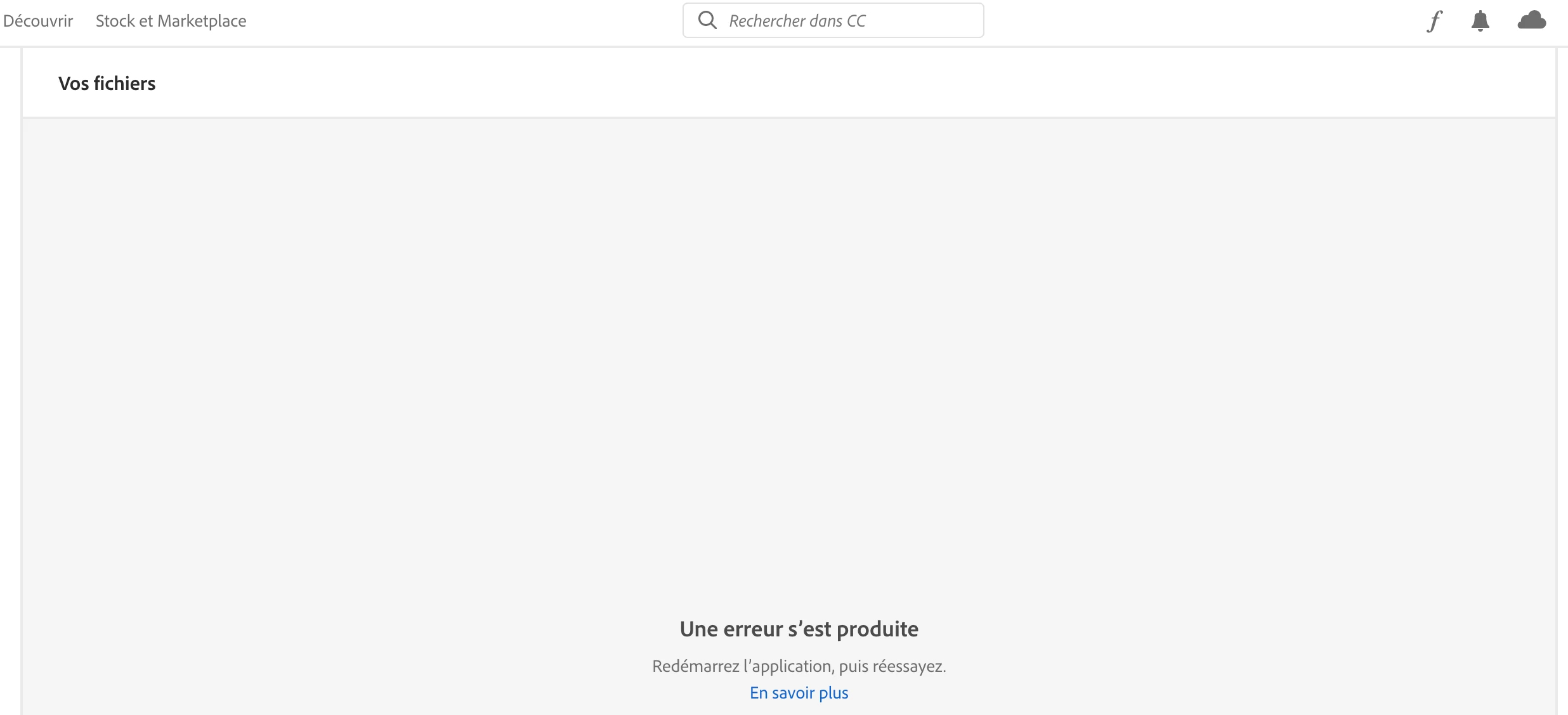 Je ne parviens plus à accéder ni aux fichiers partagés ni à tout autre document (illustrator en l'occurence) enregistré en ligne. Depuis environ début décembre 2021, dans Creative Cloud, onglet Fichiers, il est seulement indiqué "Une erreur s'est produite" ; rien d'autre n'apparait. Même message dans l'onglet dédié sur AI.