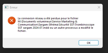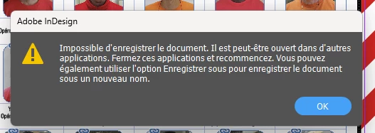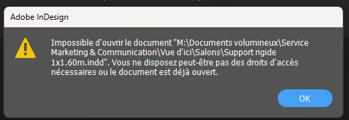 Dès que j'essaye d'ouvrir un document (Photoshop, Indesign, Illustrator), le message suivant s'affiche (voir pièce jointe) : "Impossible d'ouvrir le document "Nom du document". Vous ne disposez peut-être pas des droits d'accès nécessaire ou le document est déjà ouvert.