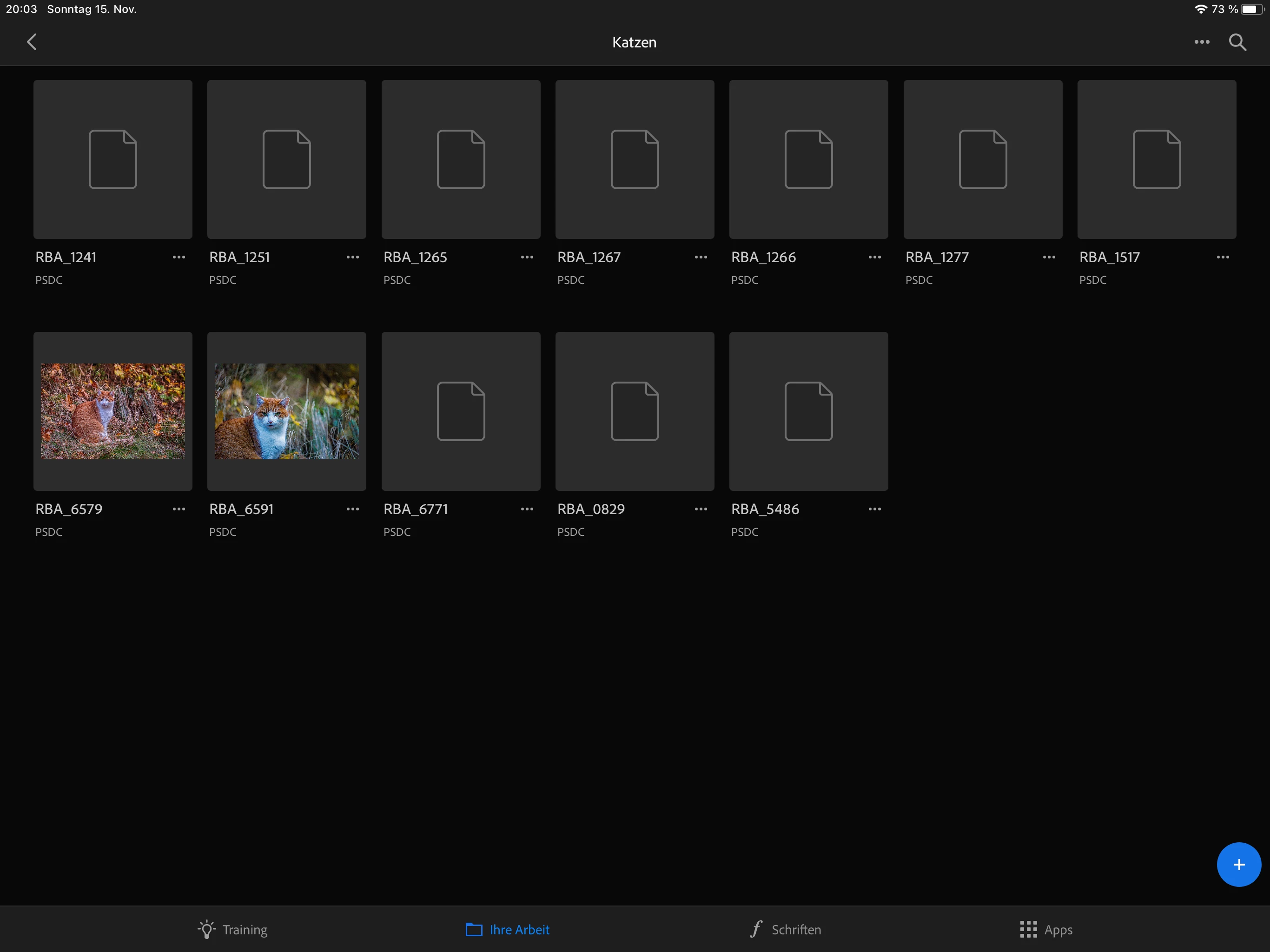 There areonly grey symbols with the names. The web view is ok, but in the creative cloud app i cant see the previews and download is also not possible.