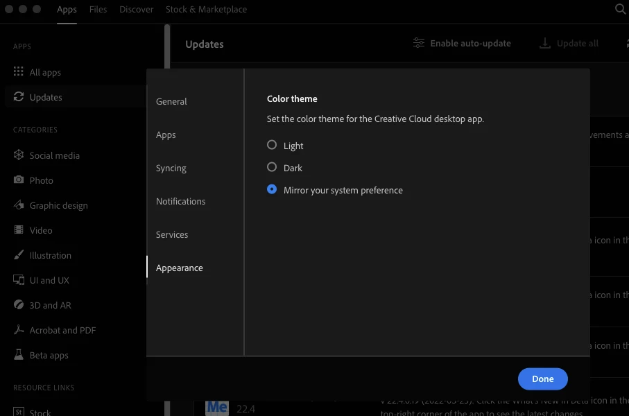 Is there a dark mode setting for Creative Cloud Desktop app?