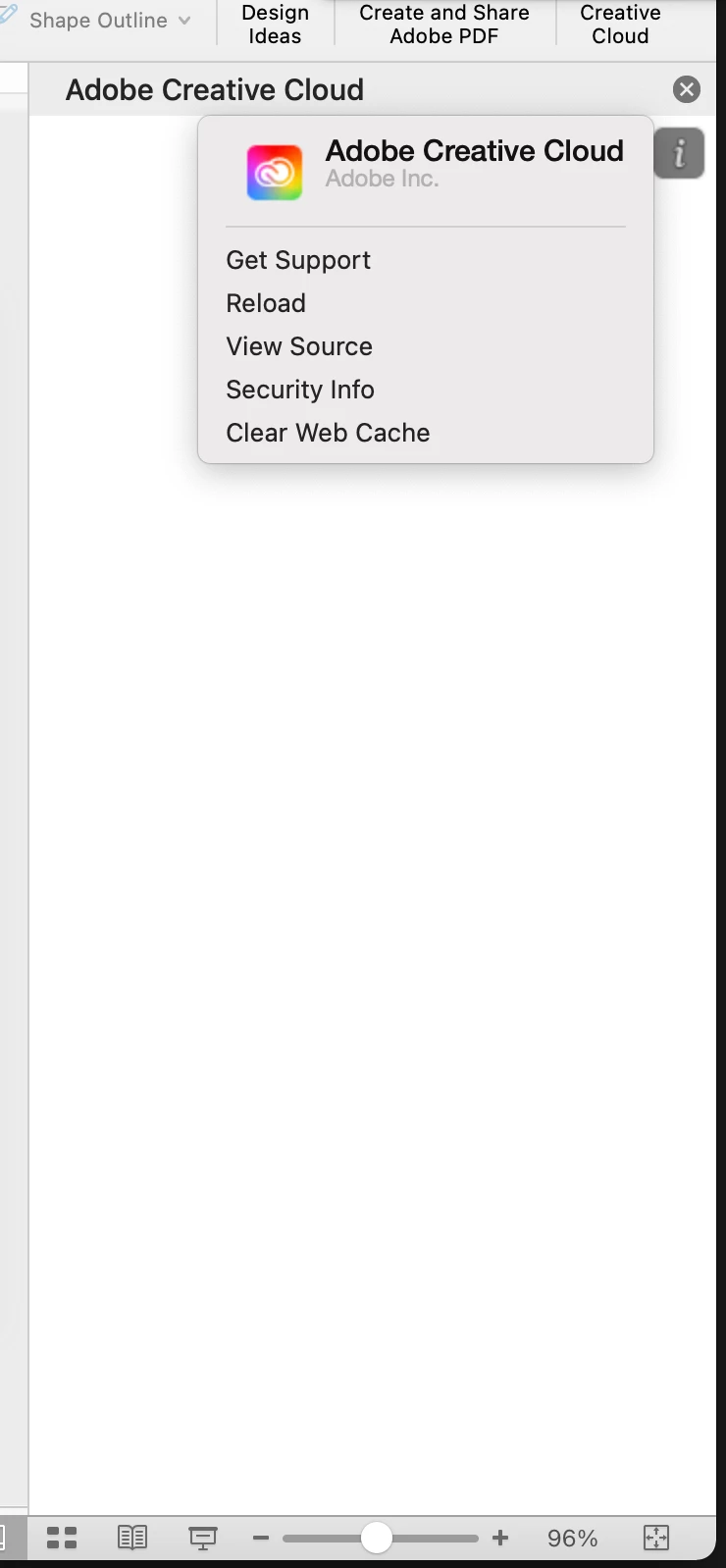 I have uninstalled and reinstalled, deleted keychain certificates, restarted powerpoint and creative cloud, but still when we try to log into the Adobe Creative Cloud add-in panel nothing is showing: