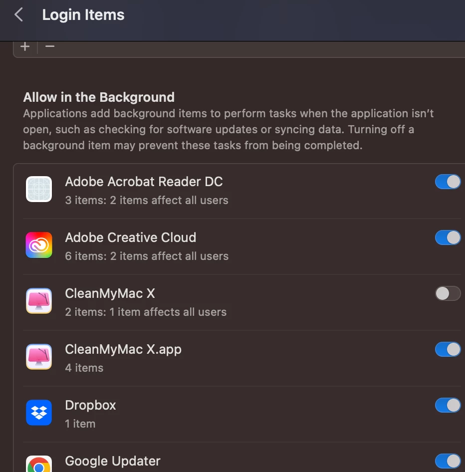 As I am using the MacBook and installed my premium creative cloud, but when I permit to run background into setting > login item after the shower