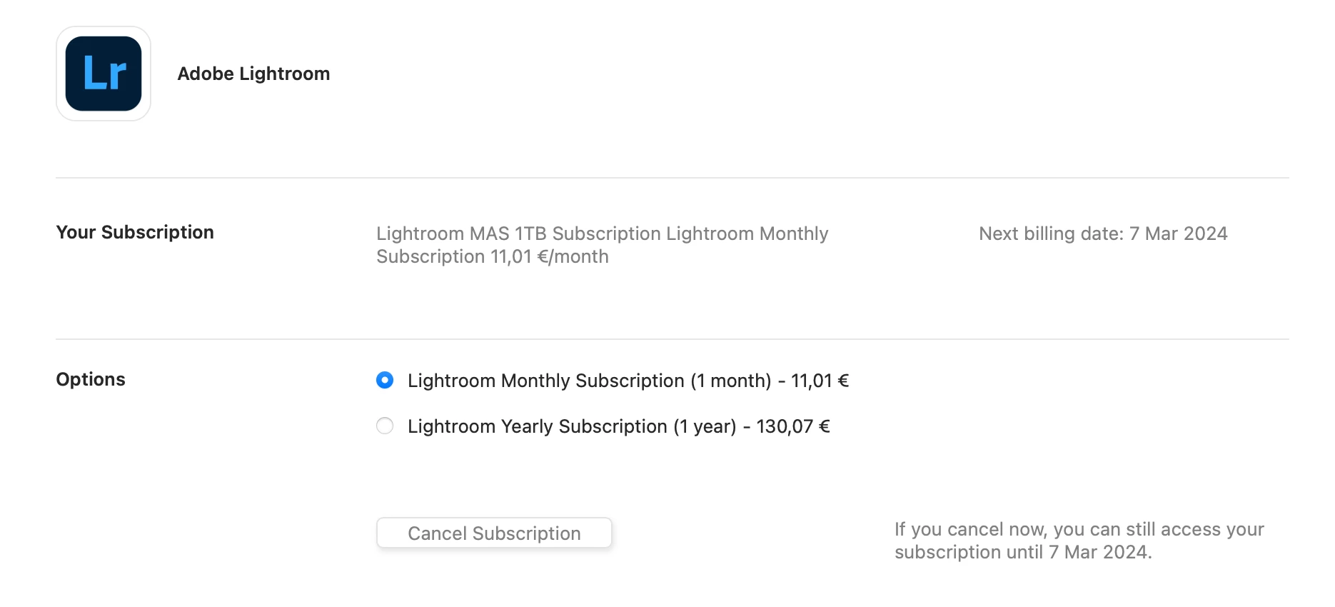 I need to buy a 2TB plan, but since Adobe is not available for direct purchase in Serbia, my subscription is via Apple's App Store on Mac.