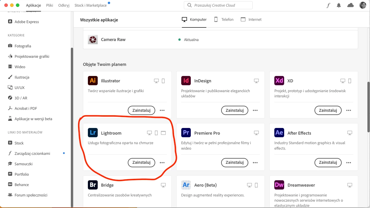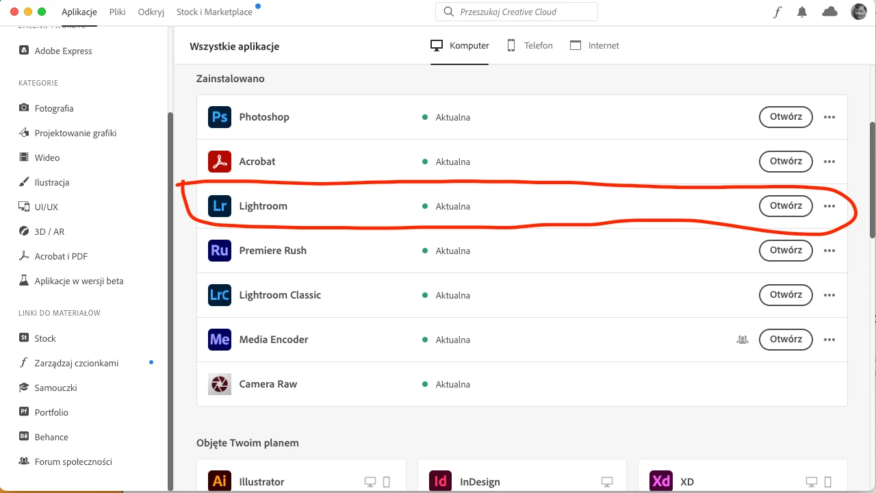 And then ... surprise. Pressing Open (Otworz) makes nothing. Also, I don't see the App installed on my system. Of course, I may login to my account and use Lightroom from the browser but why the application is not installed on my desktop?