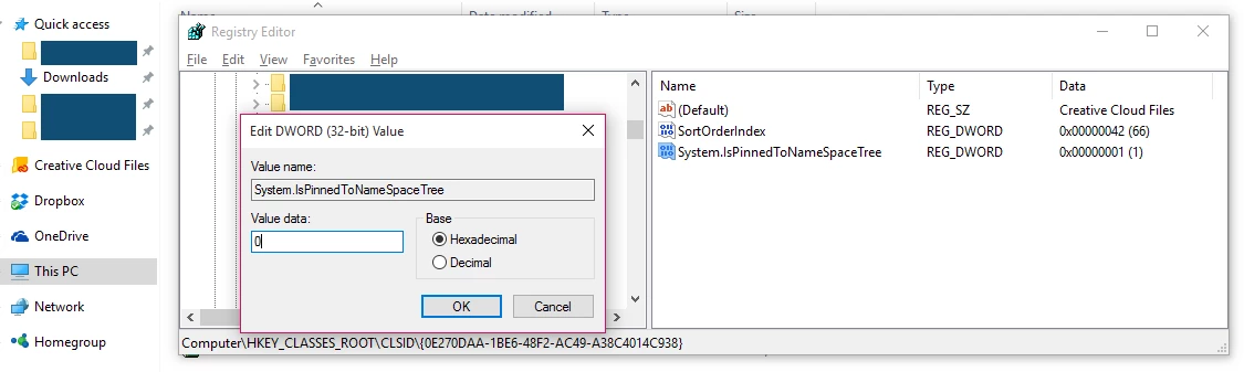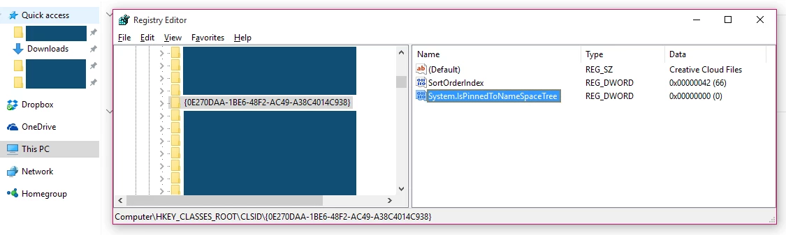 Did Adobe disable this workaround or something? I don't have this key in my registry. I tried searching for System.IsPinnedToNameSpaceTree which brings up one entry unrelated to CC, and Creative Cloud Files which brings up a couple keys