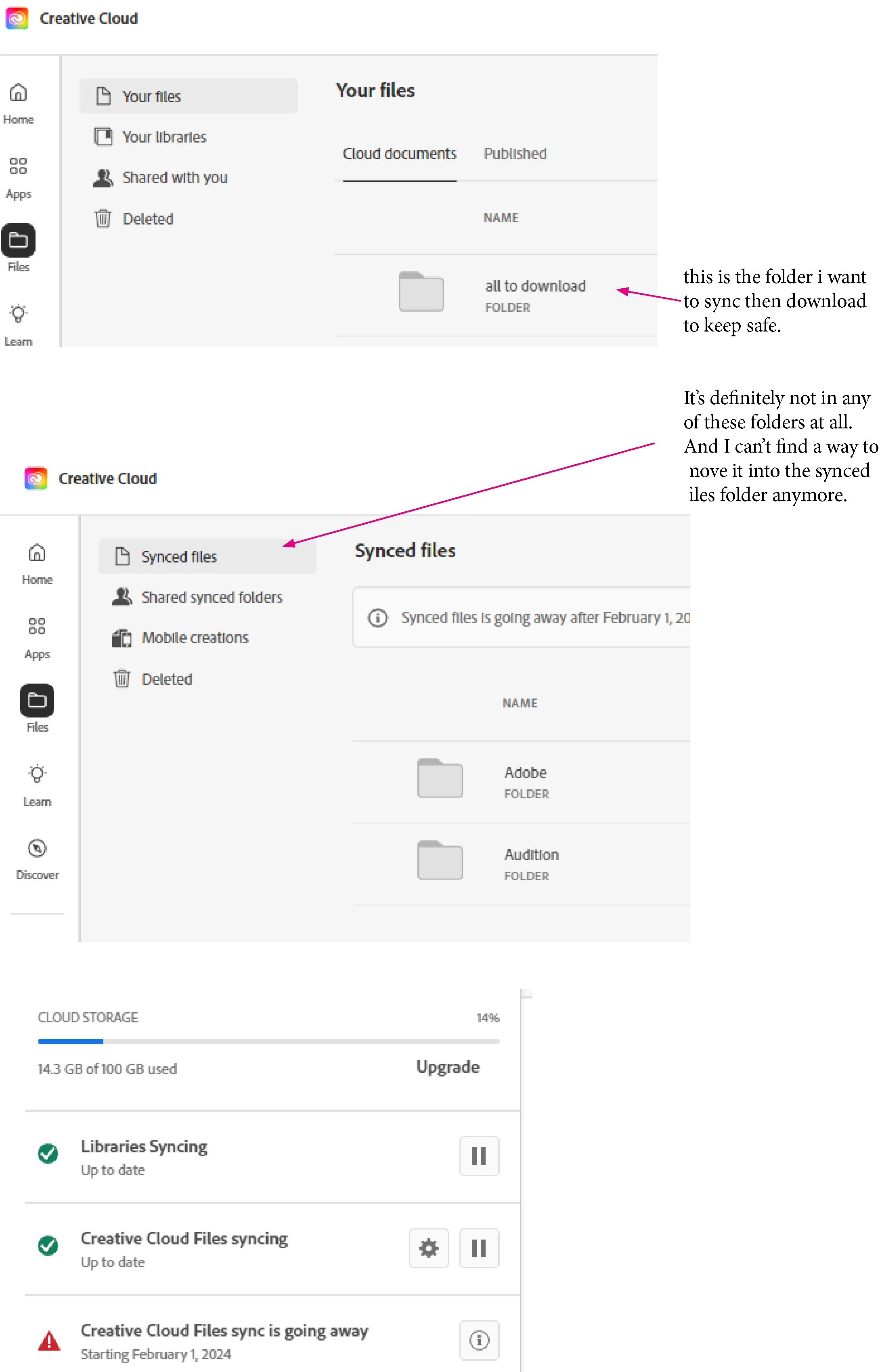 I want to move them back into synced folder and sync to my desktop so I can bulk move them into another storage space before syncing disappears.