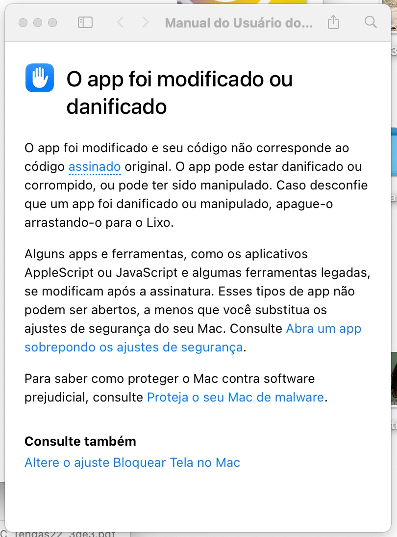 Quando clico em "ok" a mensagem volta a aparecer. Se clico em "Mostrar no Finder", sou direcionada à pasta ondeo app está salvo, mas nada acontece quando clico nele. Se clico em "?", abre uma mensagem que diz "O app foi modificado ou danificado":