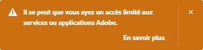J'ai le message d'alerte "Il se peut que vous ayez un accès limité aux services ou applications Adobe." à l'ouverture de Creative Cloud. J'ai appliqué le protocole proposé avec le lancement du logiciel sensé réparer. Mais rien n'y fait. Le message persiste.