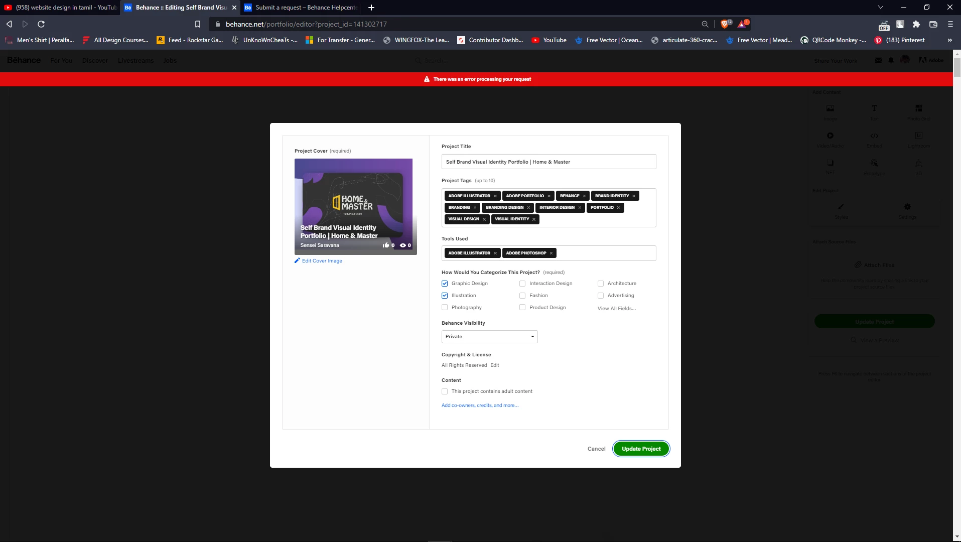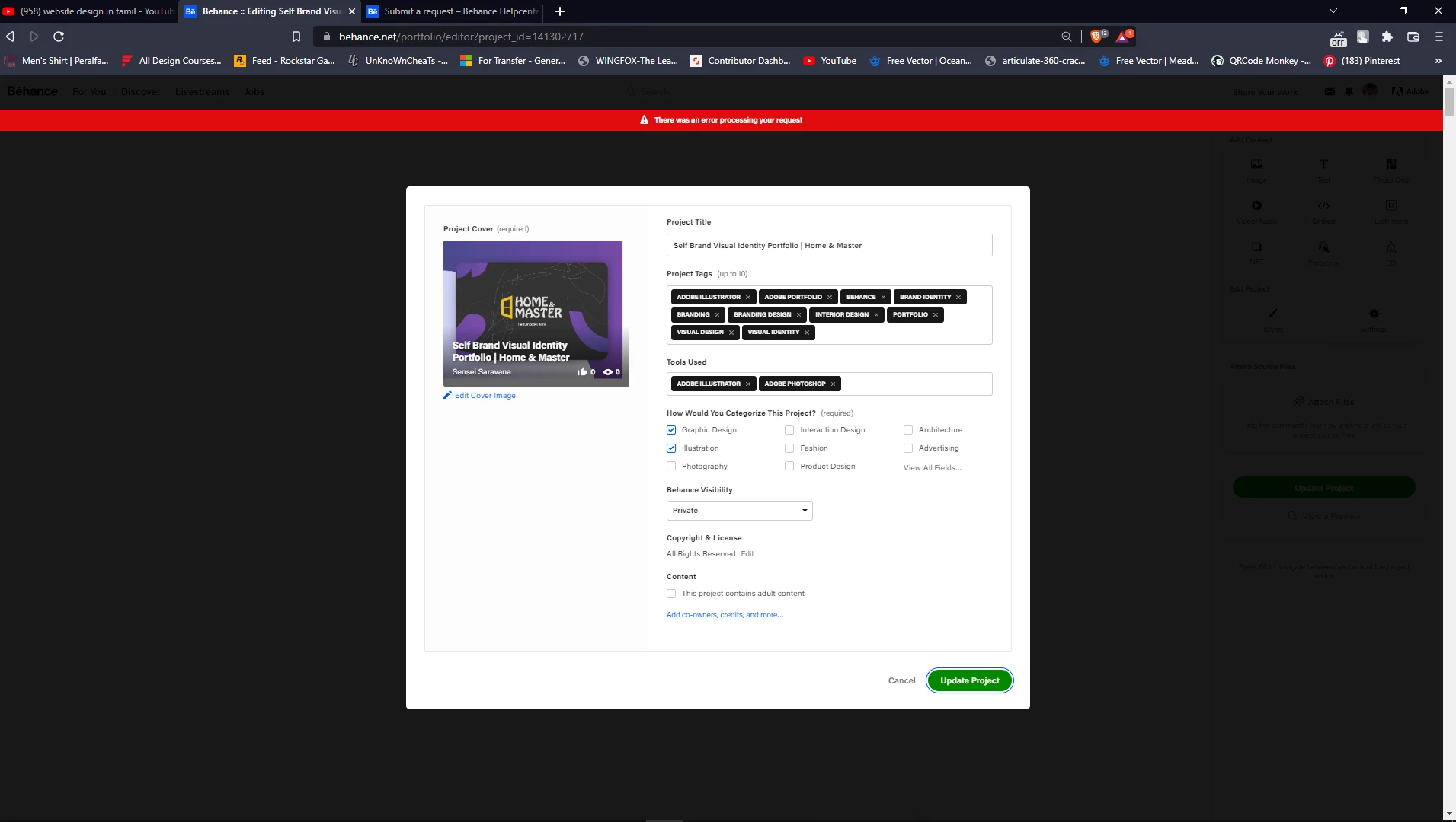 I also tried to change the project status from 'Private' to 'Everyone' and it said 'There was an error processing your request'.
