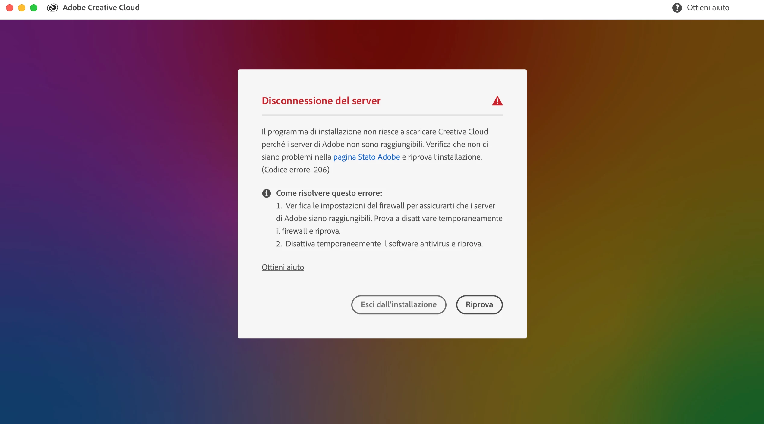 Salve continuo a provare ad installare creative coluds desktop ma l'applicazione non sis collega ai server adobe. Ho un macbook pro 2023 con os ventura 12.3.2. Come posso risolvere. Vi allego un video di cosa accade.
