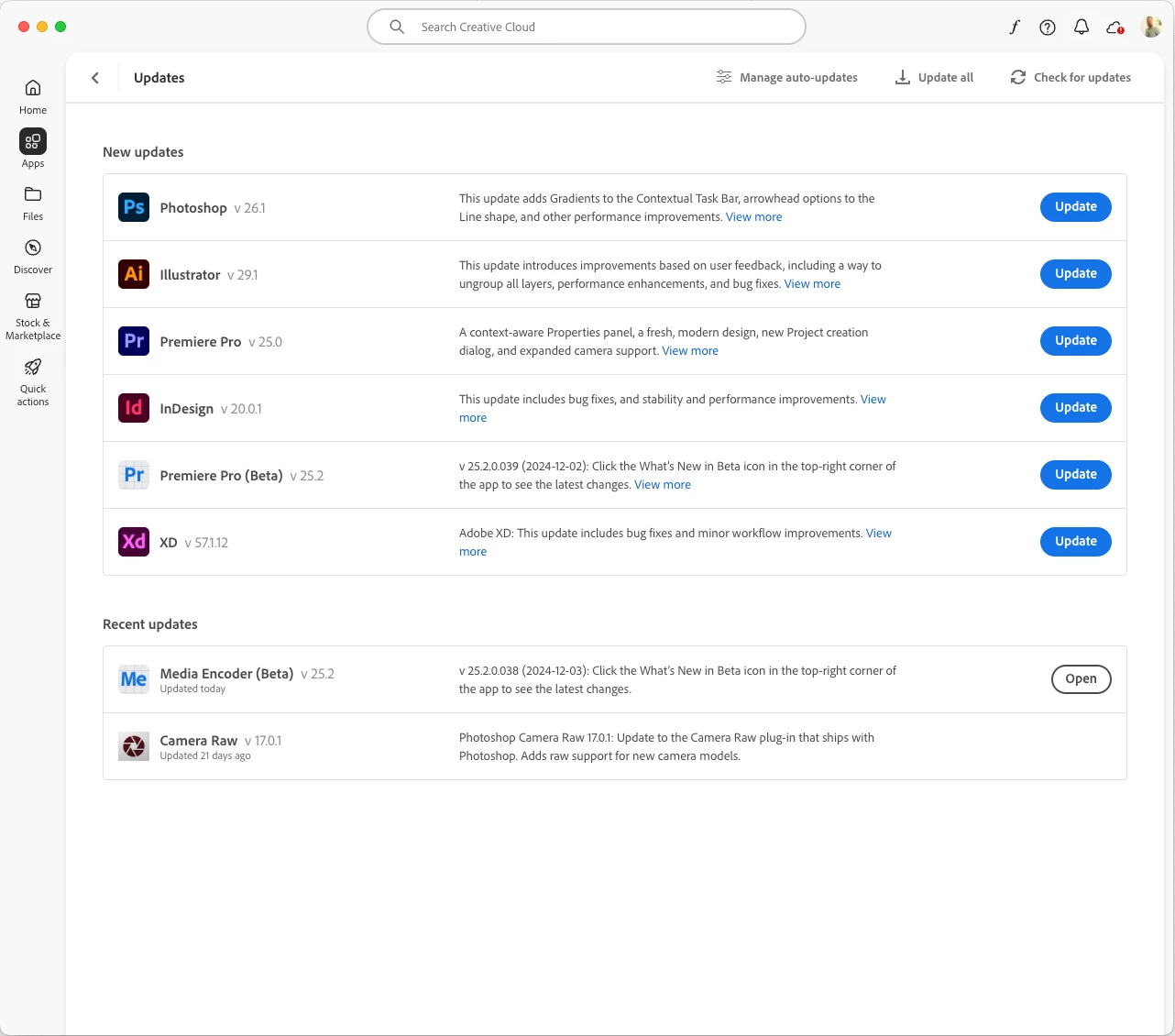 When I open Creative Cloud I have 6 uppdates. But when I try to update them nothing happens? Tried to with the all button and individual. I have restart Creative Cloud, restart the computer but still nothing?  I have a Mac Studio OS Sequoia 15.1.1 (24B91).