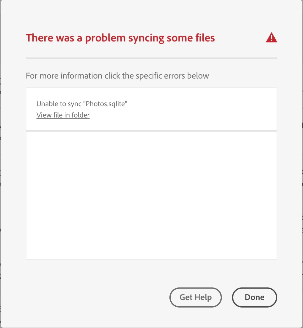 JosephAnthonyWParticipantForum|Forum|2 years agoMarch 12, 2023QuestionPhotos.sqlite file doesn't sync.Forum|Forum|2 years agoMarch 12, 20233 replies989 viewsWhat is the purpose of the "photos.sqlite" file, and why does it continually not sync? I am running Ventura 13.2.1 and the Creative Cloud syncing process seems to stop on the "photos.sqlite" file.Anyone have some insight into this situation?Creative Cloud