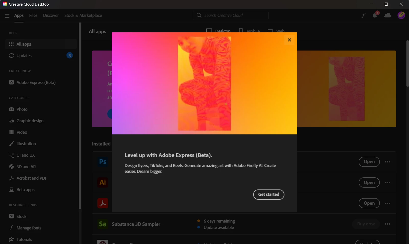 In the latest version of Creative Cloud, users are now being shown a popup to "Level up with Adobe Express (Beta)." and a "Get Started" button. Clicking the button takes them to a webpage to get startet with Express.