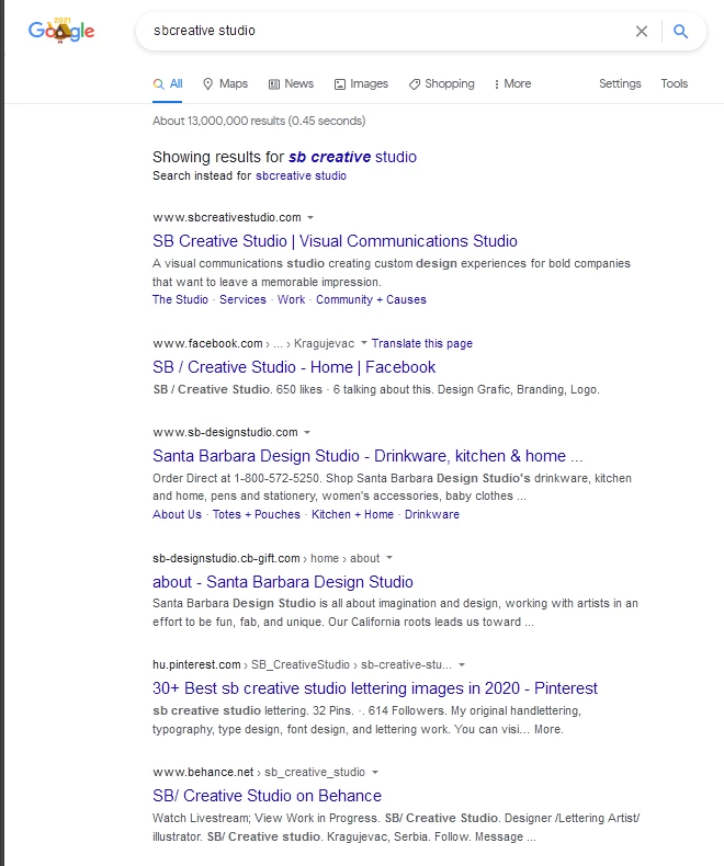 For what it's worth, I'm in California and when I do a Google search for sbcreative studio, I don't see your portfolio URL in my search results.  Try clearing your browser's cache.  Or use another browser.